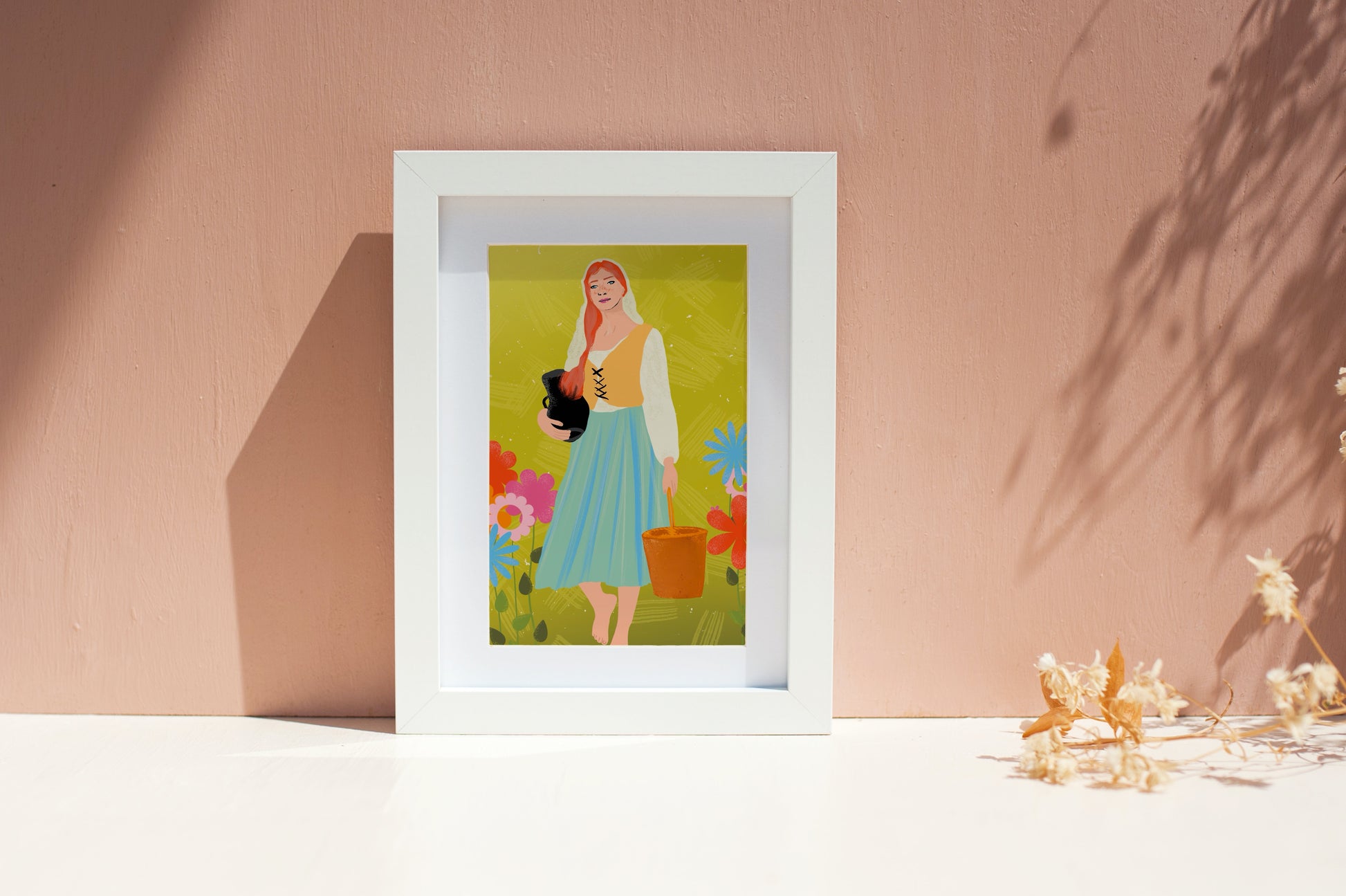 Girl in the Countryside illustration printed on beautiful and tick 300 gsm matte paper. They are available in a square size of A5 (14.8cmx21cm). Unframed.